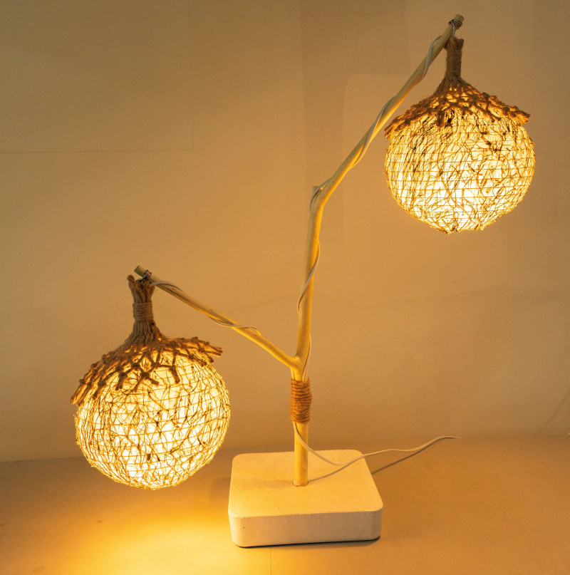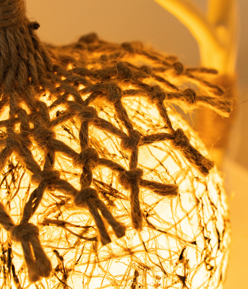 全燈使用環保永續材料,表達循環再生的訴求與價值:以廢棄蚵殼磨粉製成燈座,廢棄漁網編織成燈罩,在地構樹製成燈架。
